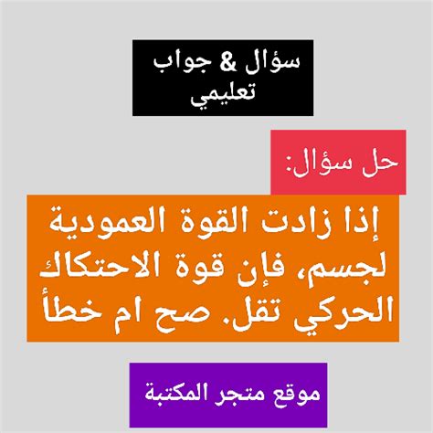 صواب أو خطأ، تسمى القوة ضد الحركة قوة الاحتكاك الاحتكاك هو قوة السحب التي تحدث عندما يتحرك سطحان متجاوران في