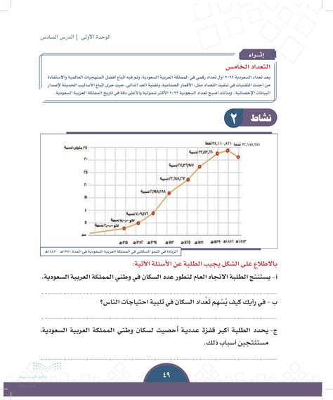 يحدد الطلاب أكبر قفزة عددية تحسب لسكان بلدي الأم المملكة العربية السعودية، ويستنتجون أسباب ذلك: تعمل المملكة العربية السعودية بشكل