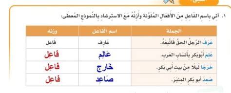 أتيت من الأفعال الملونة باسم الفاعل ووزنها بتوجيه من النموذج المعطى، فاللغة العربية لها أسماء وتنقسم إلى مشتق وخامل، والصلب
